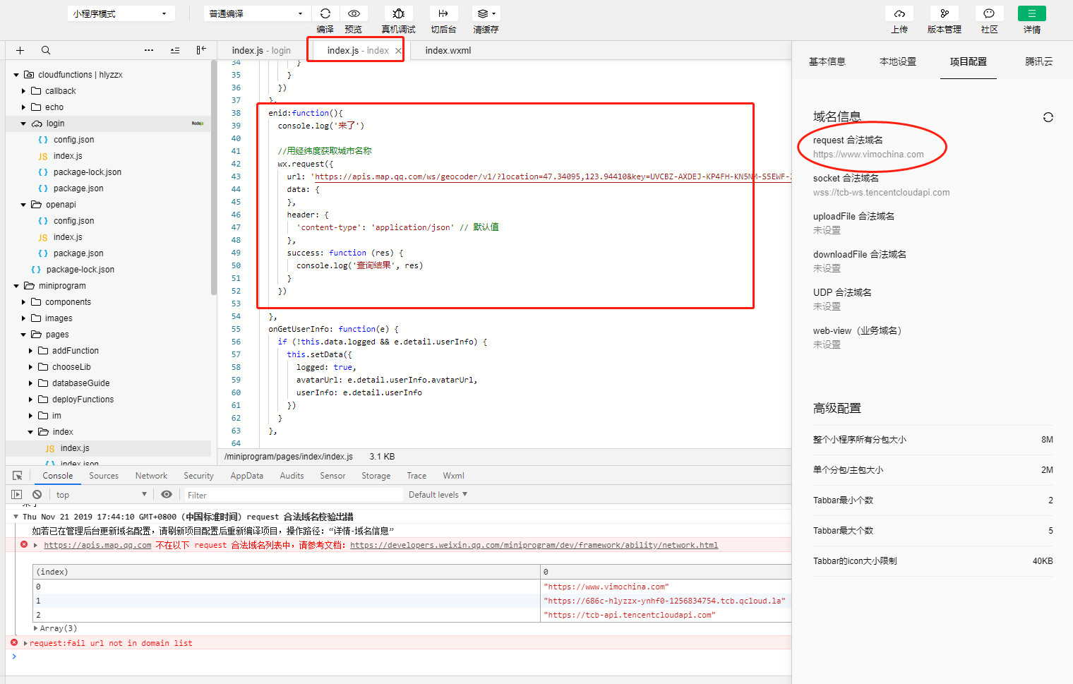 可以在项目设置里面开启【不校验域名】,但是不推荐你这样做(免得到时候忘了,然后说线上版不能用