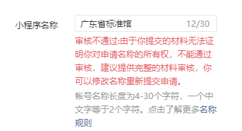 审核意见:由于你提交的材料无法证明你对申请名称的所有权,不能通过审核,建议提供完整的材料审核,你可以修改名称重新提交申请。