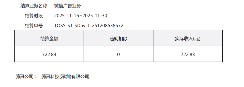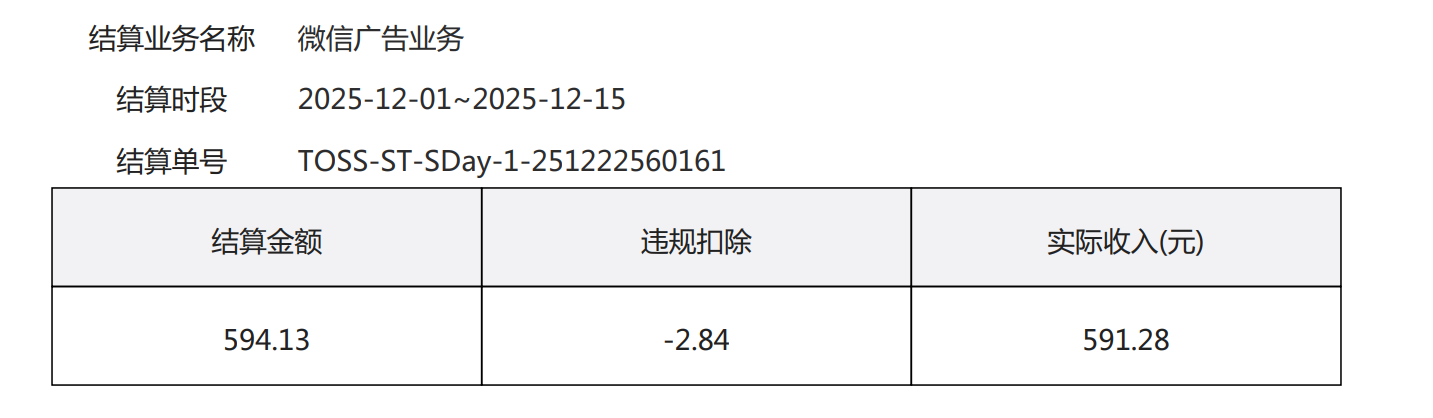 你好,结算单金额为税前金额。个人账户的收入属个人劳动报酬,劳务报酬所得以个人当月取得的同一项目下的多次收入合并为每次收入所得,定额或定率减除规定费用后的余额为应纳税所得额。11月下半月和12月上半月这两笔结算收入属于同一期纳税,根据国家税法,需要合并计税。个人缴税说明及计算方式可参考官网帮助中心:https://ad.weixin.qq.com/docs/295