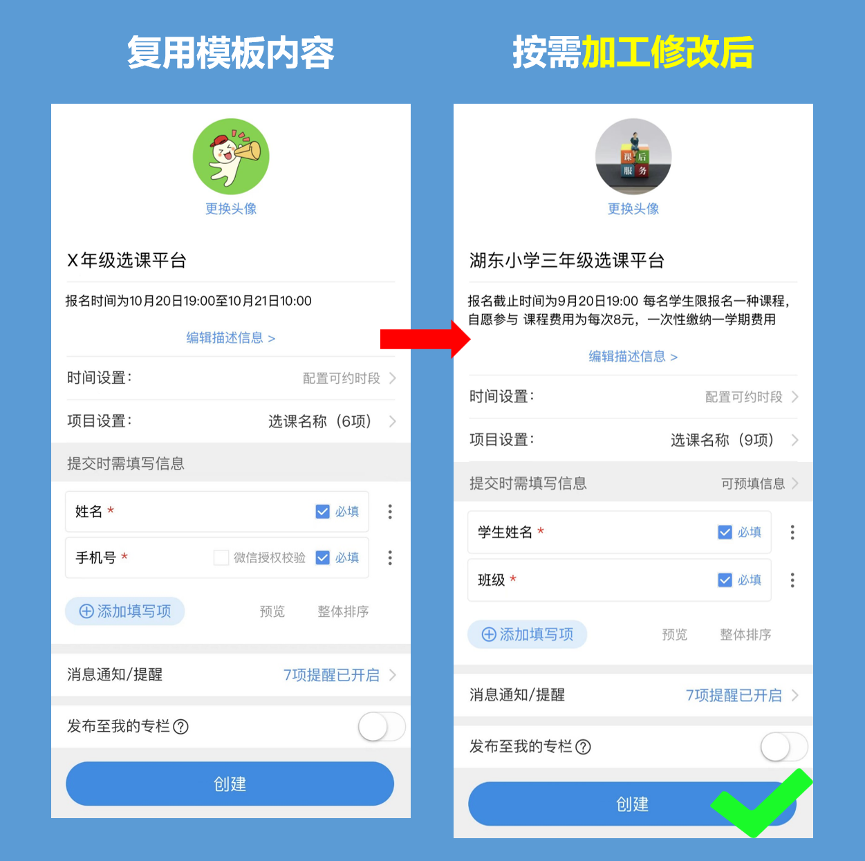 参照模板已有内容,按需进行修改和调整(比如课程项目、报名须知信息、报名需提交的信息等),不超过3分钟,就可以完成配置并立即启用了