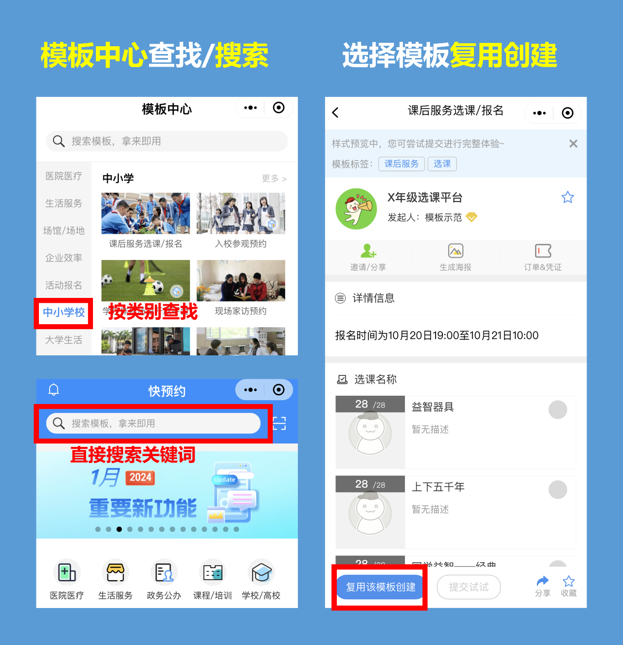快预约基于为数百所学校服务经验,沉淀下成熟的【选课】模板,复用模板即可快速创建: