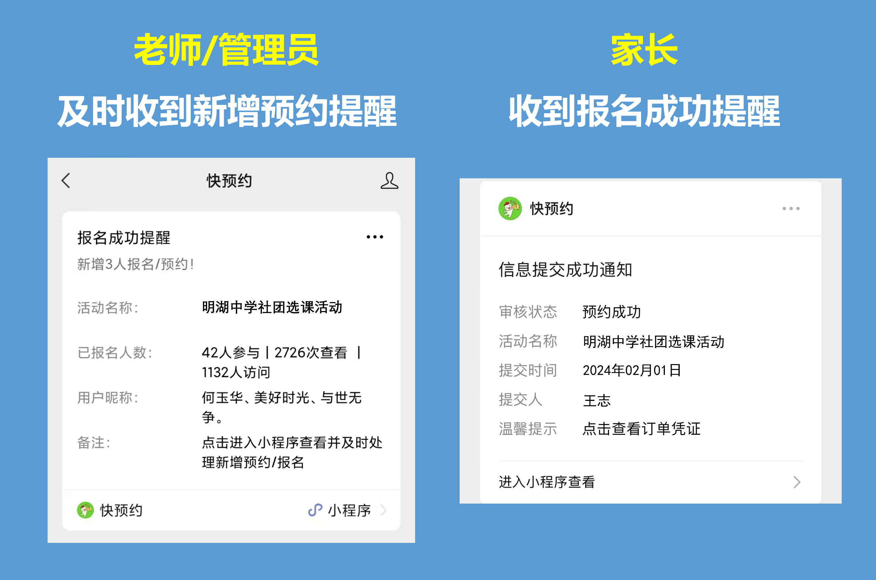 ④ 进展及提醒:新增一定数量的报名后,老师可及时收到新增通知及进展数据,可以随时查看到各课程的名额剩余情况。家长报名成功后,也会立即收到报名成功通知: