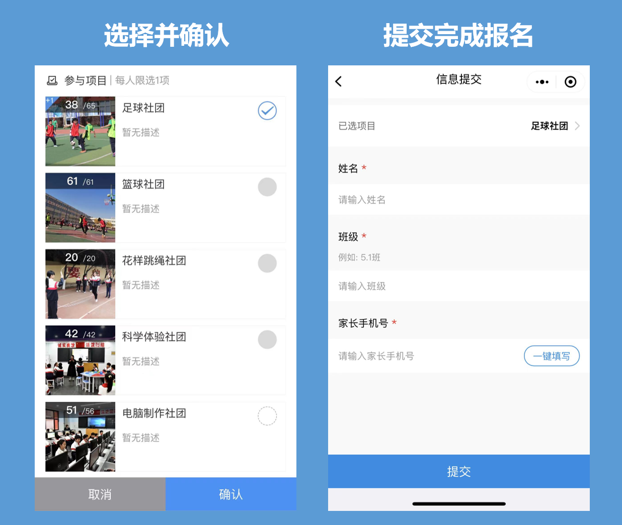 ② 选择及提交:勾选需要的课程/社团,填写信息后即可提交完成报名(支持对精准控制每人每学期可选择的多门课程,避免选择重复的课程进行报名):