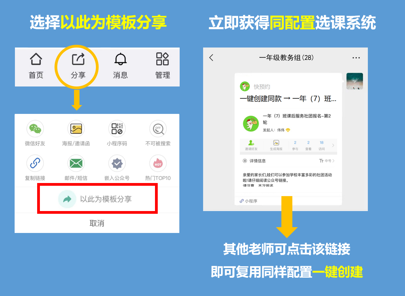 一个年级或一所学校的选课平台配置好后,其他年级/分校无需重复配置,可通过【模板分享】功能,快速分享给其他年级/分校的老师,实现「一人建好全校/多校复用」: