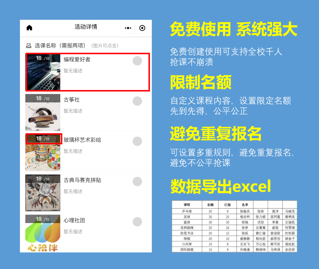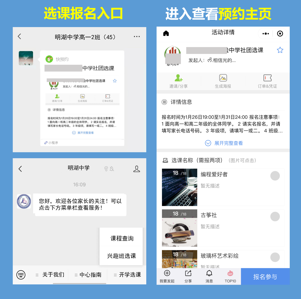 经过4年沉淀,如今已打磨出一套较为成熟的微信在线选课系统,老师及家长无需下载任何APP,只需要通过微信即可完成选课平台搭建及在线报名,可全面覆盖全校、年级、班级等多种维度的选课抢课报名需求: