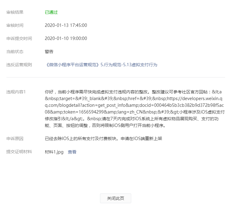 经核实,小程序于2019-1-3涉及虚拟支付违规被封禁IOS搜索能力,请按正常流程在功能封禁站内信中发起申诉即可,会有相关人员审核。