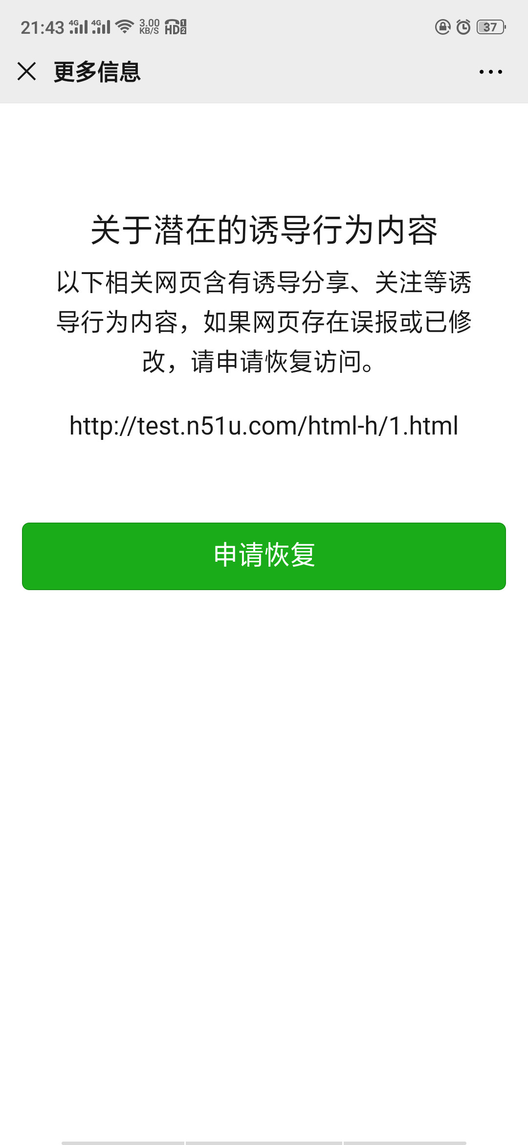 我查看了提示链接,可此链接无法打开。根据链接查找域名的DNS设置,并没有找到相关test.n51u.com的解析内容,根据常理http://test.n51u.com/html-h/1.html链接是不可能存在的,DNS设置已截图,请领导明察。再次就是本站点已经通过了晋ICP备15001942号-2和晋公网安备 14040202000155号双重备案,来监督确保站点不会发布非法内容。麻烦技术部门跟进处理下,或者如果确实有问题的话能给个详细明确的回答。谢谢!