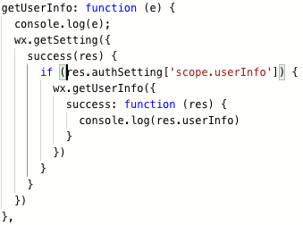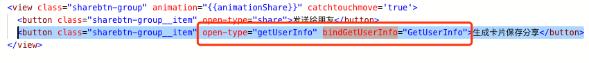 示例: <button open-type="getUserInfo" lang="zh_CN" bindgetuserinfo="onGotUserInfo">获取用户信息</button> 问题: 1.bindgetuserinfo是要用小写的 2.绑定的方法名:调用的是GetUserInfo 但在js中,方法是 getUserInfo