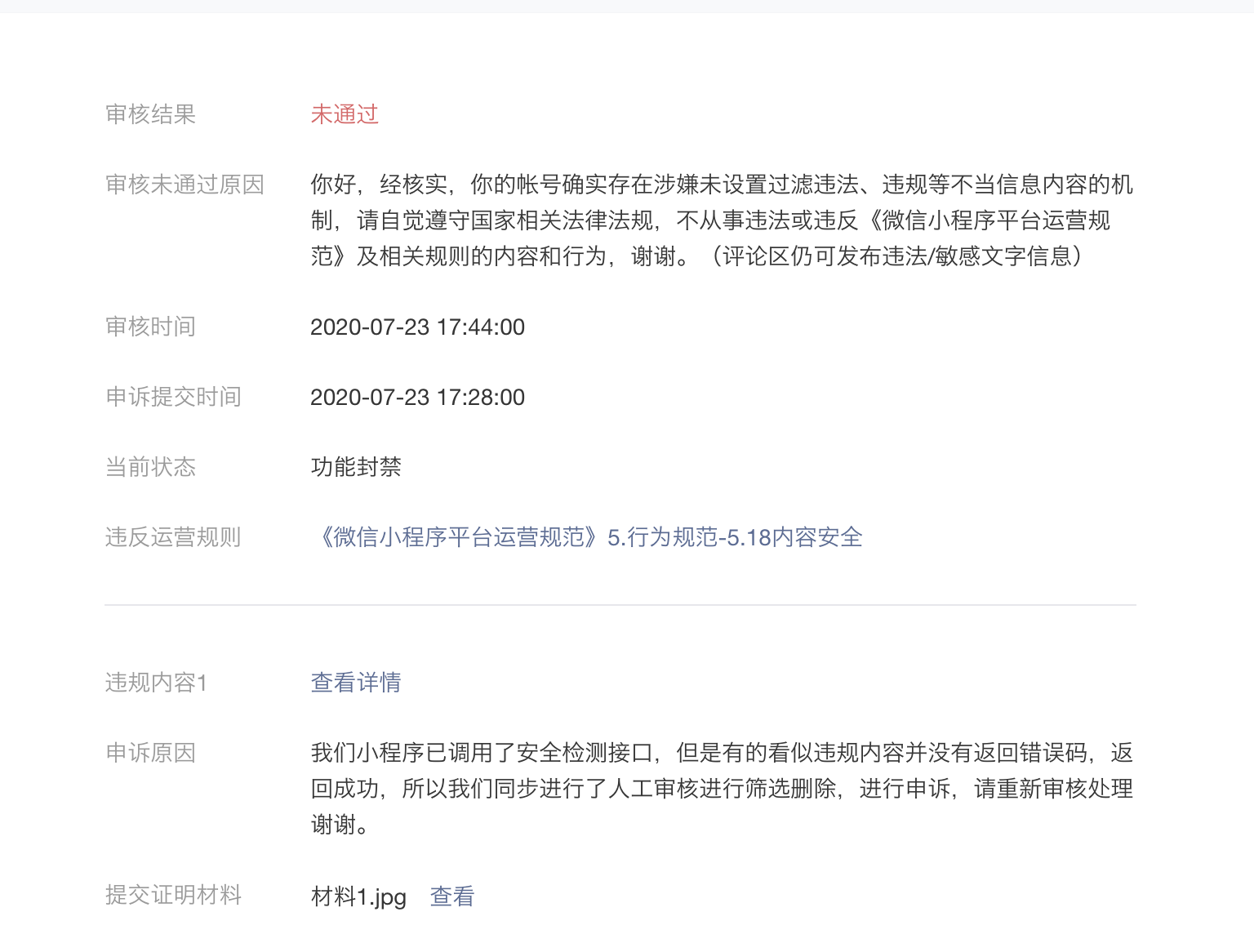 你好,经核实,你的帐号确实存在涉嫌未设置过滤违法、违规等不当信息内容的机制,请自觉遵守国家相关法律法规,不从事违法或违反《微信小程序平台运营规范》及相关规则的内容和行为,谢谢。(评论-仍可发布违法/敏感文字信息)