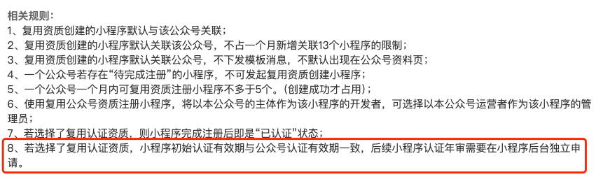 目前公众号快速注册并认证小程序:若选择了复用认证资质,小程序初始认证有效期与公众号认证有效期一致,后续小程序认证年审需要在小程序后台独立申请。