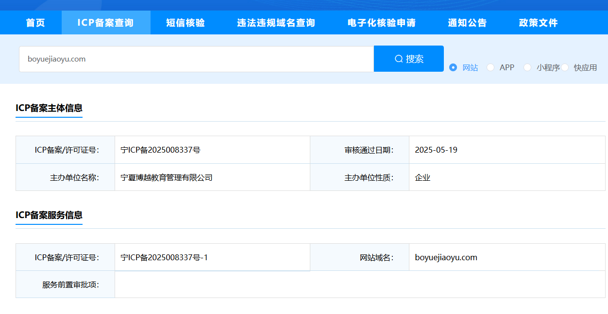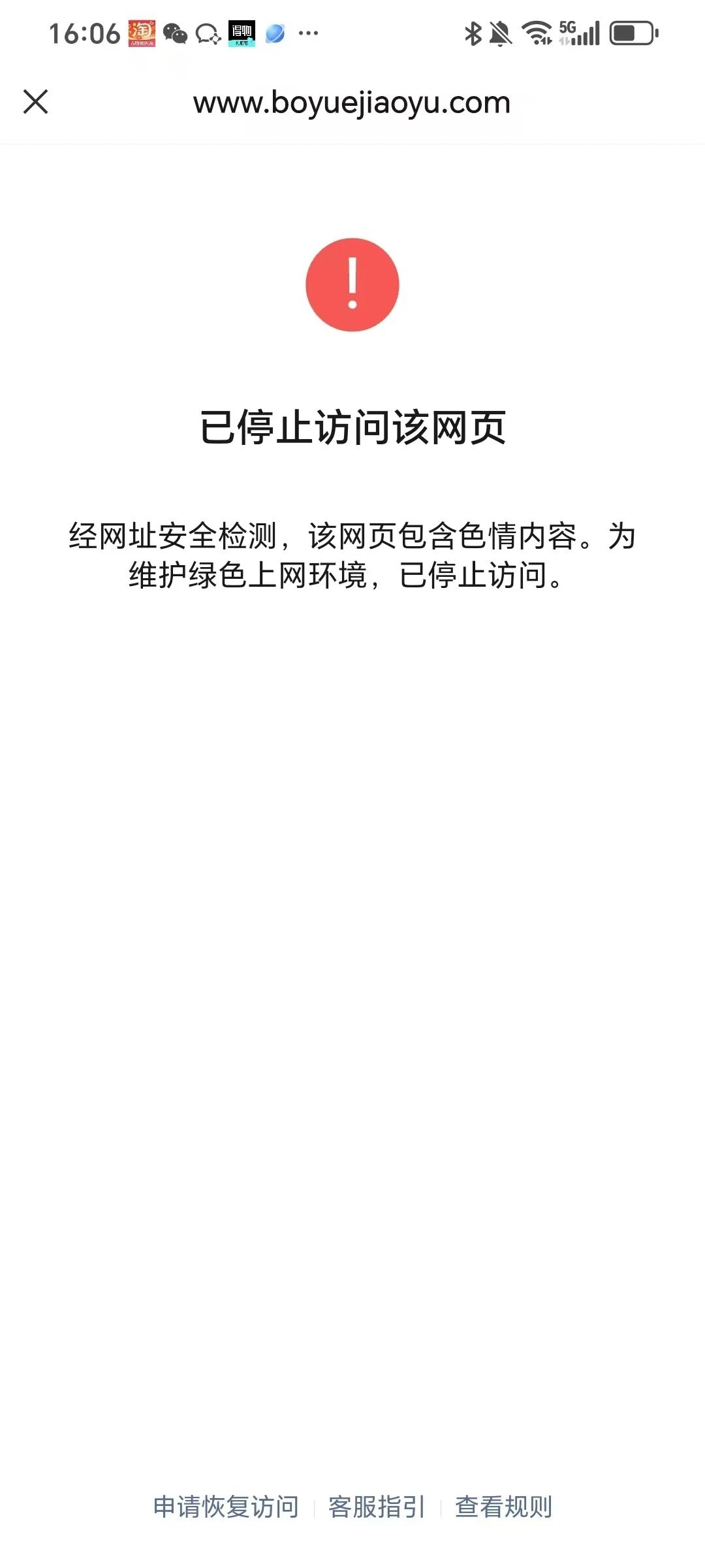 boyuejiaoyu.com由我司2025-04-29日购买注册,并已于2025-05-19备案成功,备案号:宁ICP备2025008337号备案通过后,就没有办法在微信中打开,提示经网址安全检测,该网页包含色情内容。为维护绿色上网环境,已停止访问遭到拦截,但是我司没有违法违规的行为,请明察。