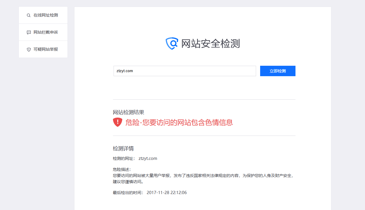 你好,经核实域名 ztzyt.com被手机管家拦截,本系统只处理被微信暂停提供微信内直接访问的服务的外部链接的申诉问题,若非前述事宜,将不予答复。建议登录手机管家官网【http://gj.qq.com/online_server/complain_url.html】自行申诉,知悉。