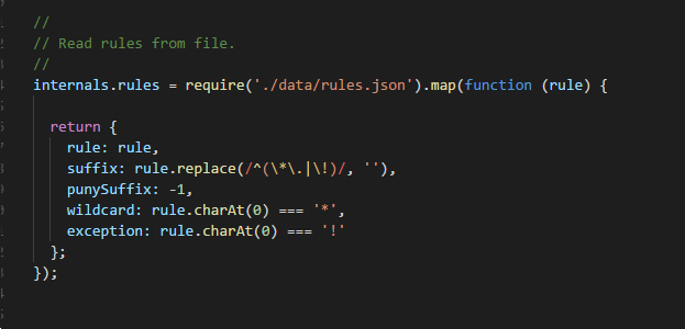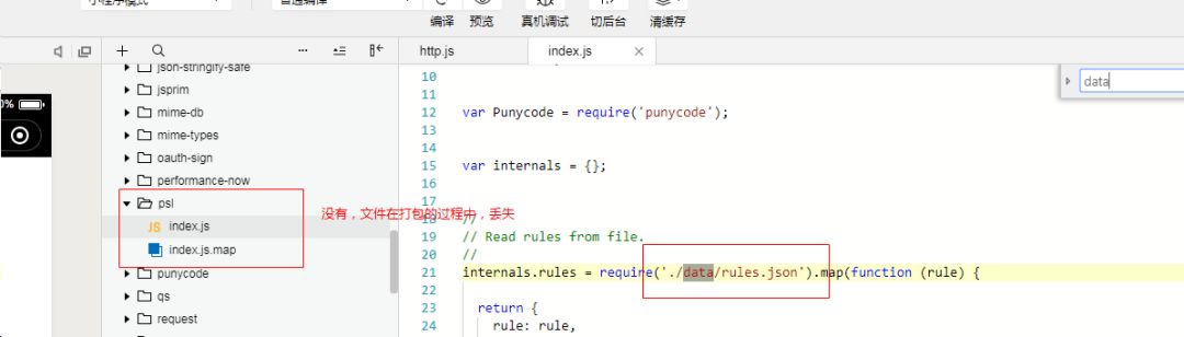 不是你截图中 psl 模块的原因,这里的 require 函数被重写过的,所以并不是 commonjs 的那个 require,你这里可以在 psl 模块构建出来的 index.js 里搜一下 ./data/rules.json,是能搜到对应内容的。