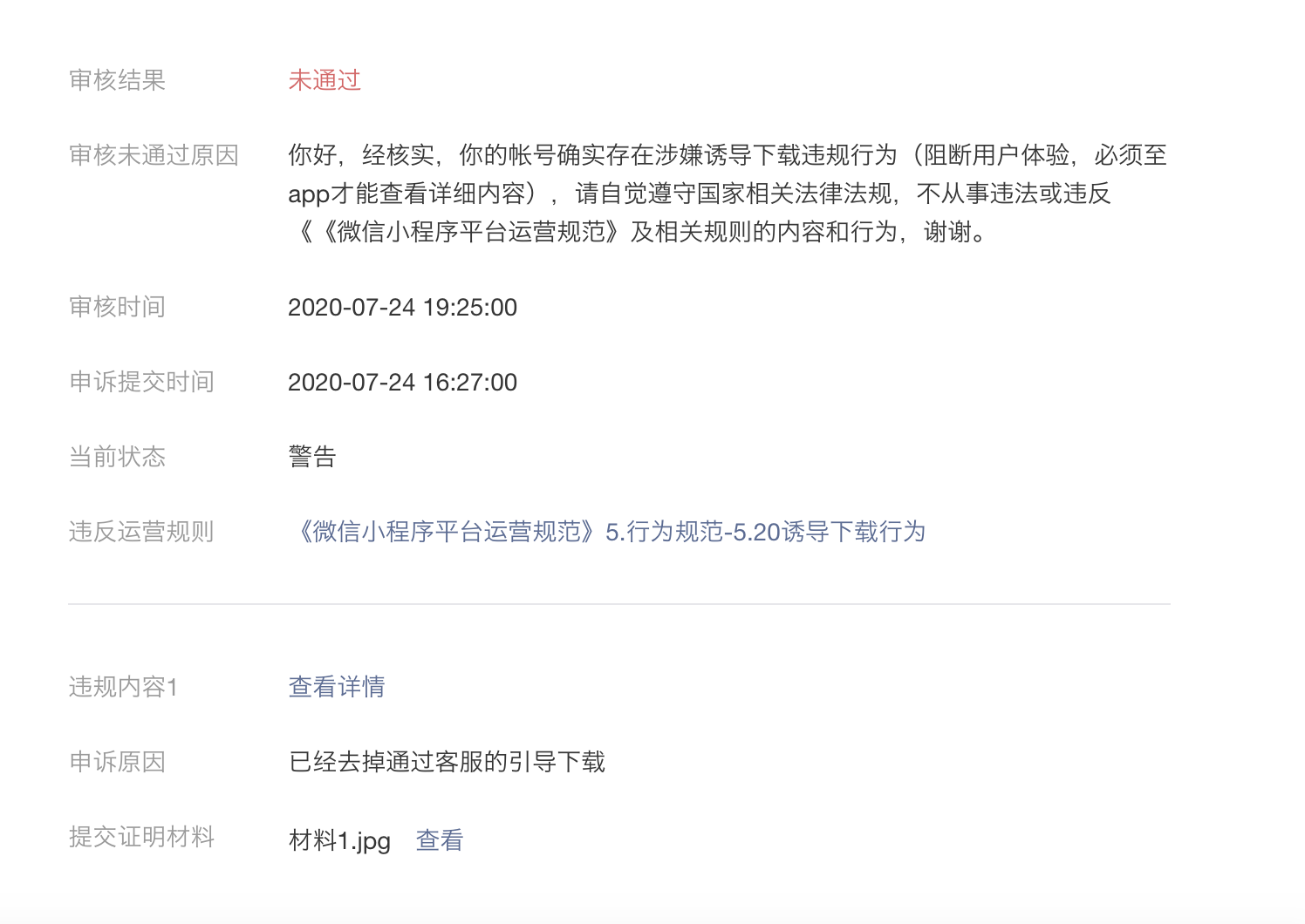 你好,经核实,你的帐号确实存在涉嫌诱导下载违规行为(阻断用户体验,多个板块提示必须至app才能查看详细内容),请自觉遵守国家相关法律法规,不从事违法或违反《《微信小程序平台运营规范》及相关规则的内容和行为,谢谢。