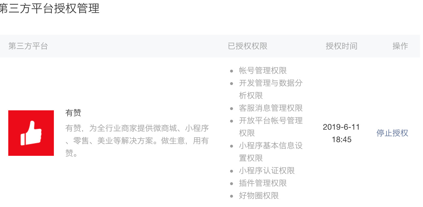 因为我司要给h5页面套个小程序的外壳,页面中有个我司有赞商城的小程序的链接,所以打不开那个链接,我看了后台的配置已经把小程序授权给有赞管理