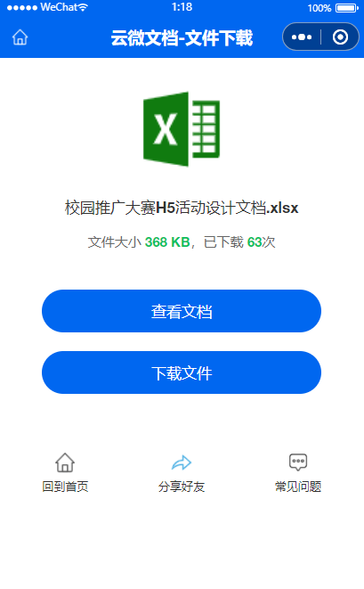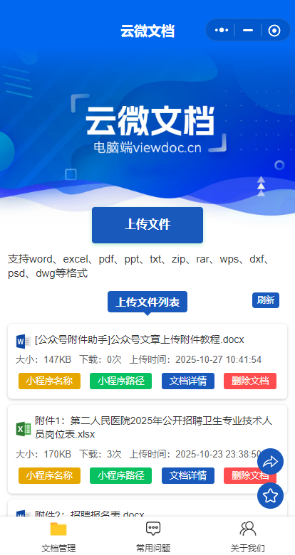可以先把文档上传到第三方小程序,推荐使用“快存文档”(viewdoc.cn)或“云微文档”(kuaidoc.cn)小程序。