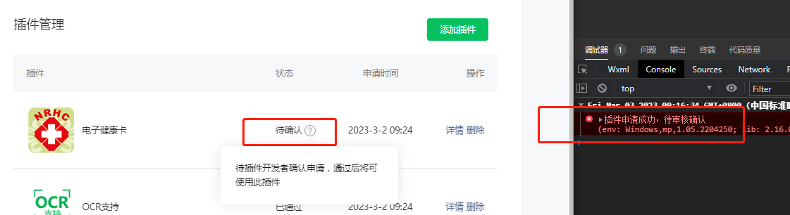 已经提交一天了,小程序后台显示插件待确认;小程序源码显示插件申请成功,待审核确定?问下插件'待确定'要审核多久才能通过啊?