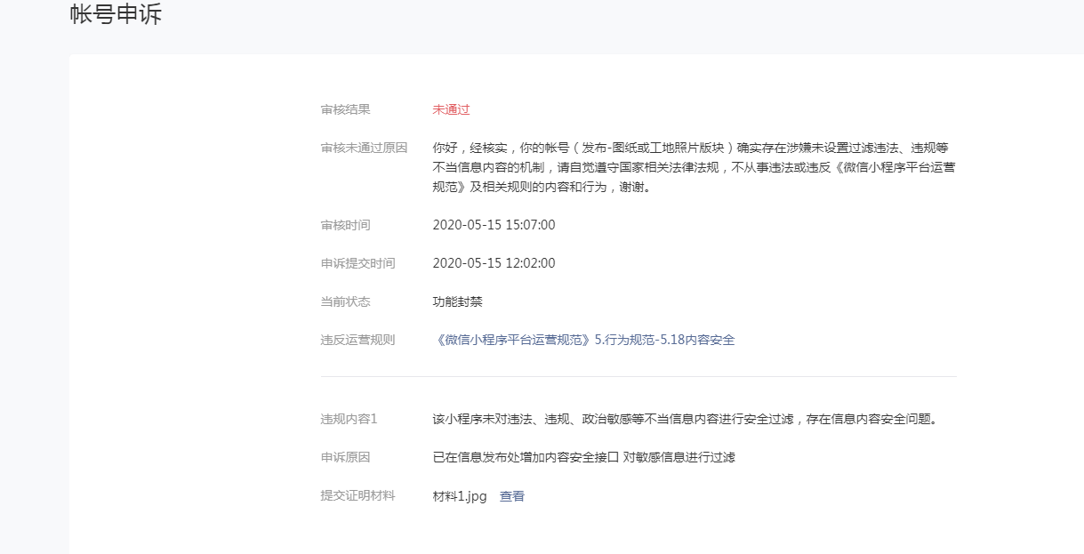我们收到小程序存在内容安全隐患后进行了整改,提交发布版本后进行了申诉,由于在图片上传处为增加过滤,申诉被驳回。现在已经在图片上传处增了过滤接口,但无法二次申诉,麻烦运营同学再审核一下,谢谢。