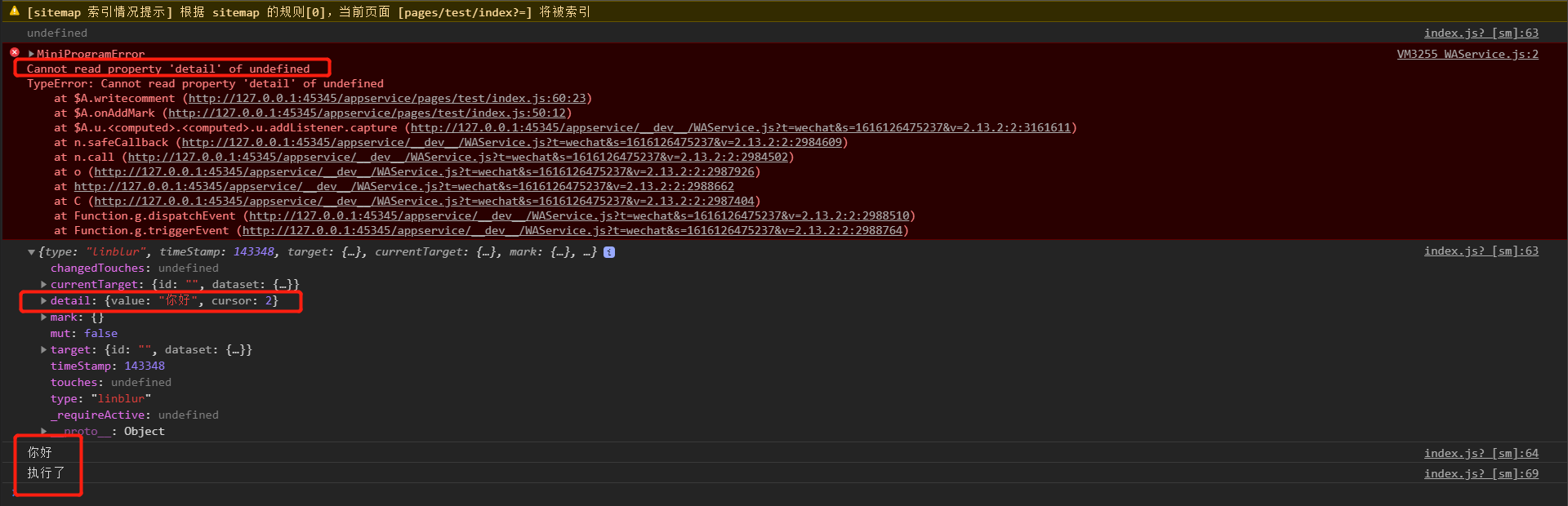 小程序打印event.detail.value,报错说Cannot read property 'detail' of undefined ,但是又有值打印出来,怎么回事?