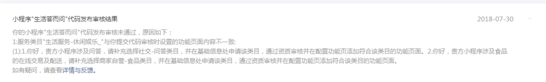 微信公众平台审核不通过结果 说这个小程序涉及到食品、问答类目,小程序页面没有这两个内容