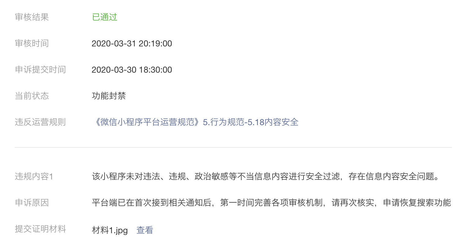 我们的小程序很早就已经完成了接入安全打击、敏感词过滤、鉴黄接口,并且已经更新了版本,但是现在小程序的隐私设置为不能被搜索,而且开启的开关也点不了,麻烦帮忙解决下,谢谢!!!