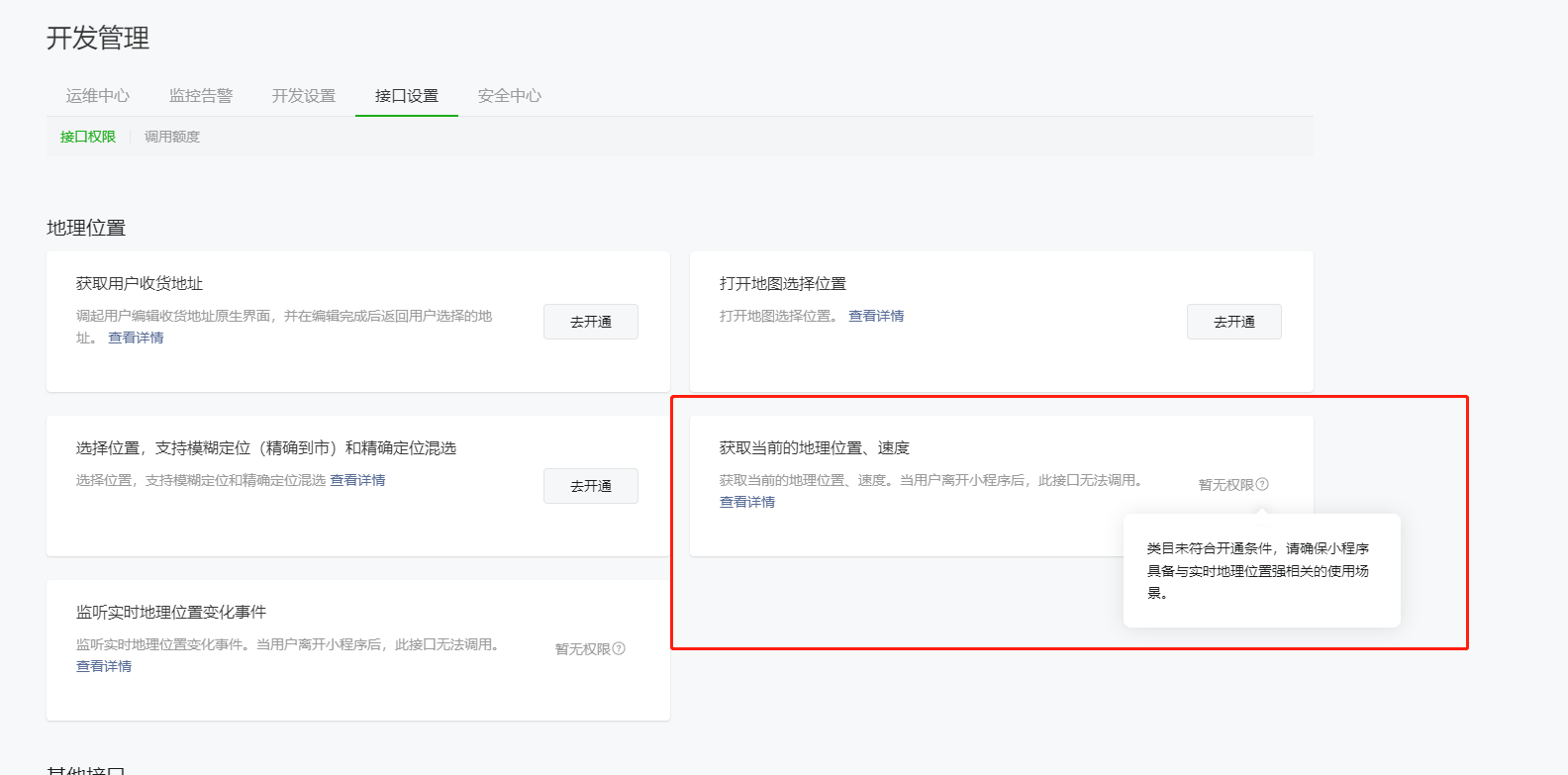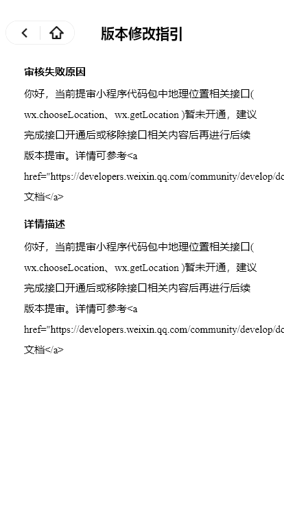 你好,当前提审小程序代码包中{{group_name}}相关接口({{api_name}})暂未开通,建议完成接口开通后或移除接口相关内容后再进行后续版本提审。详情可参考<a href="https://developers.weixin.qq.com/community/develop/doc/000e8ccb5ac498318cbd26c495bc01">文档</a>