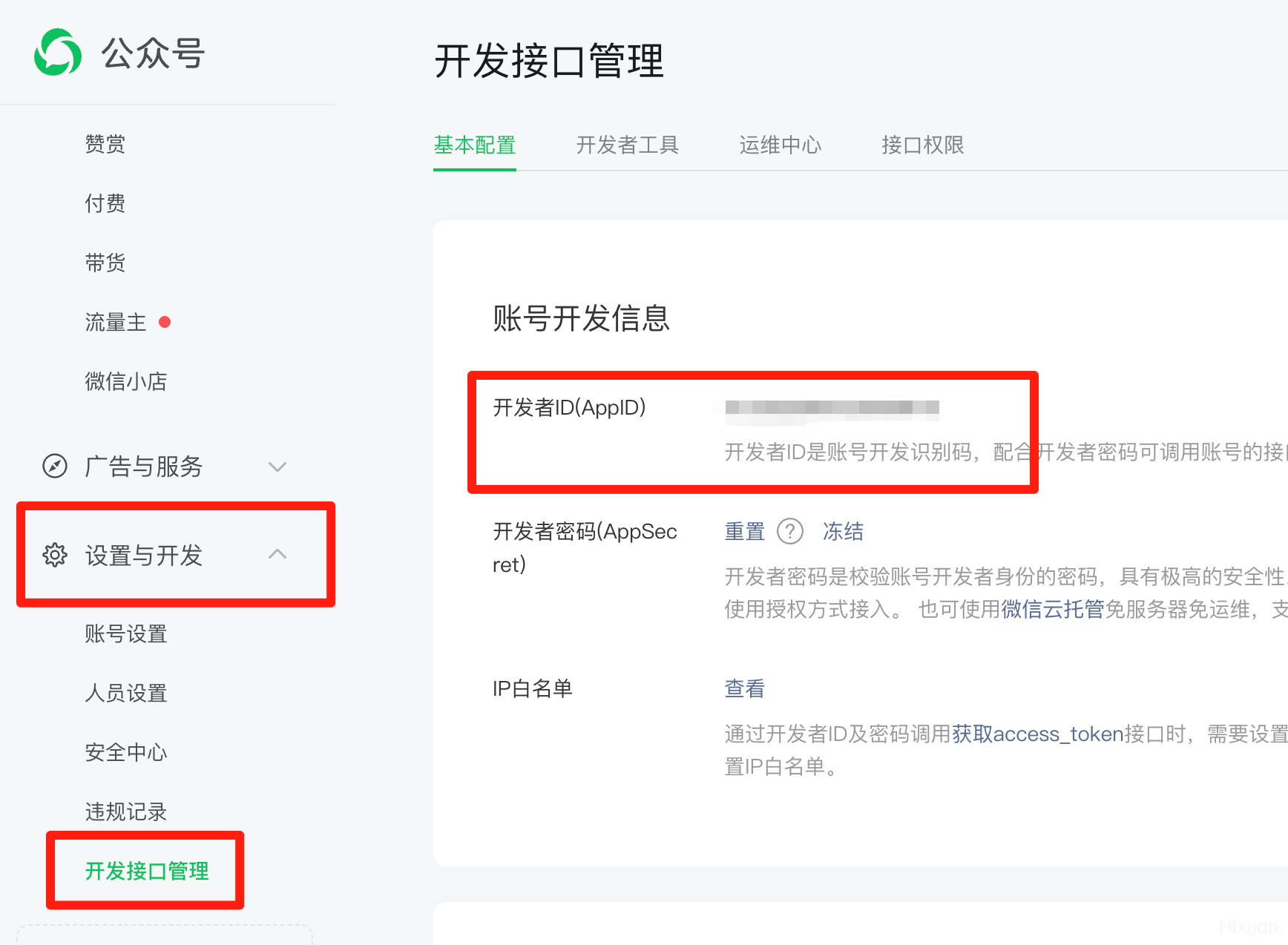 公众号开发者ID(App ID)在哪里找。公众号左侧菜单栏里找不到开发