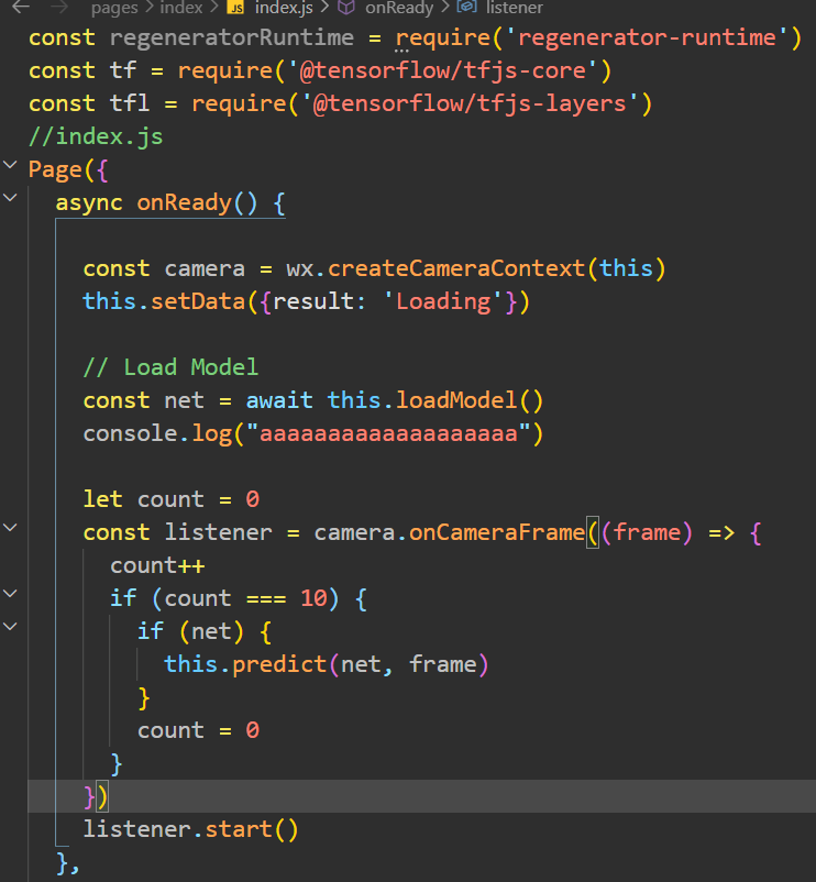 通过手动控制台输出测试,发现文件卡在了加载模型的地方:在index.js文件loadModel,这后边的代码都没执行