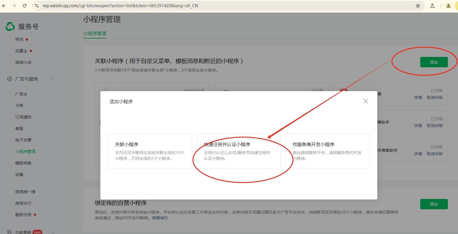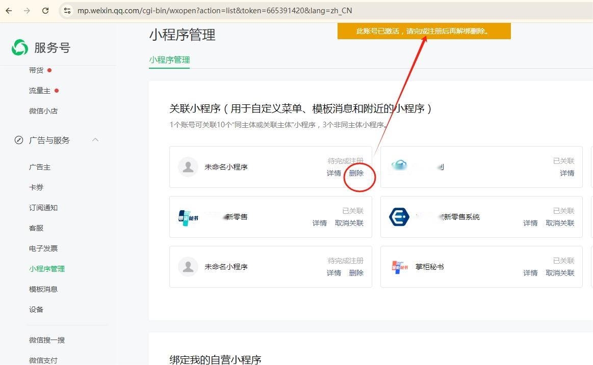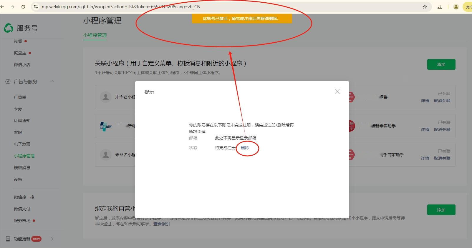 微信服务号后台添加关联小程序(快速注册并认证小程序)时提示: “你的账号存在以下账号未完成注册,请完成注册/删除后再新增创建” 点击下方删除提示“此账号已激活,请完成注册后再解绑删除。” 这几个小程序账号目前无法登录 现在死循环怎么整 怎么解决这个问题