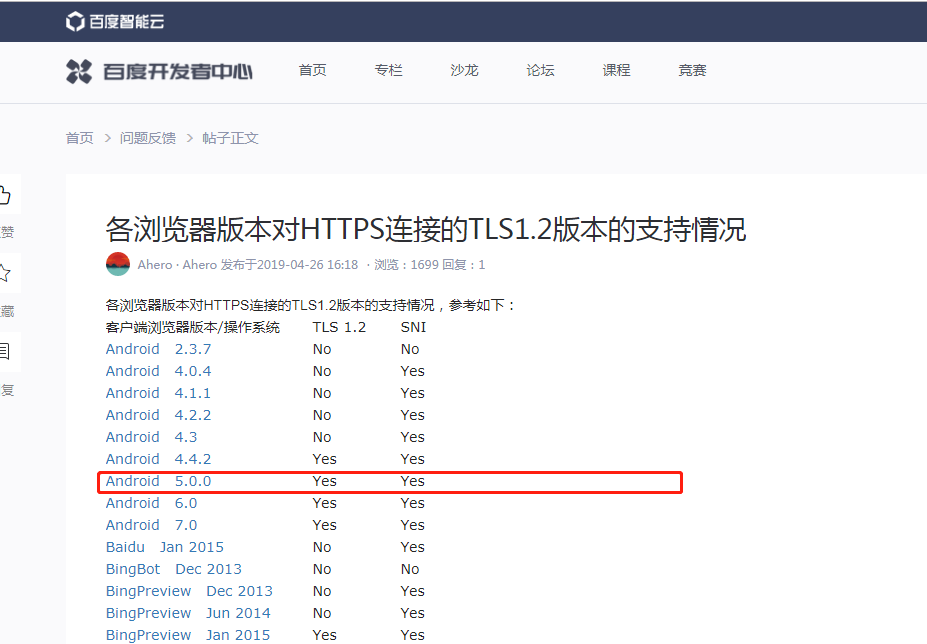问题来了,在网上翻阅了资料,安卓5.0是支持TSL1.2的,为什么请求还是报错呢?请求官方解答下!