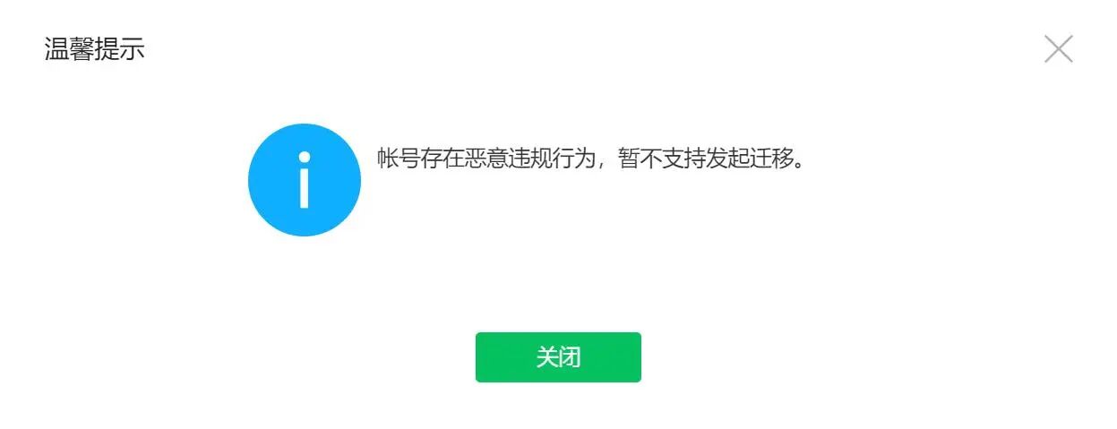 没有违规,通知中心也没有任何违规提醒消息,违规记录中也没有任何违规消息,可在我准备迁移公众号时提示“账号存在恶意违规行为,暂不支持发起迁移”,为了腾讯客服,答复效率极低,关键还答非所问,只能在这里请教,不知道有没有跟我遇到同样的问题,是怎么解决的?