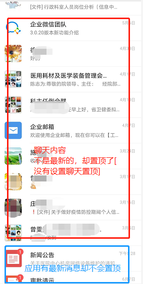最新的消息不会置顶,反而是已经浏览过的个人聊天消息一直置顶, 反复尝试各种设置都无效。