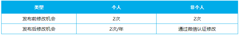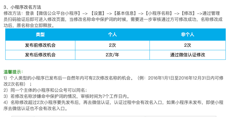 1)个人类型的小程序已发布后一自然年内可有2次修改名称的机会。(例:2016年1月1日至2016年12月1日内可修改2次名称) ;