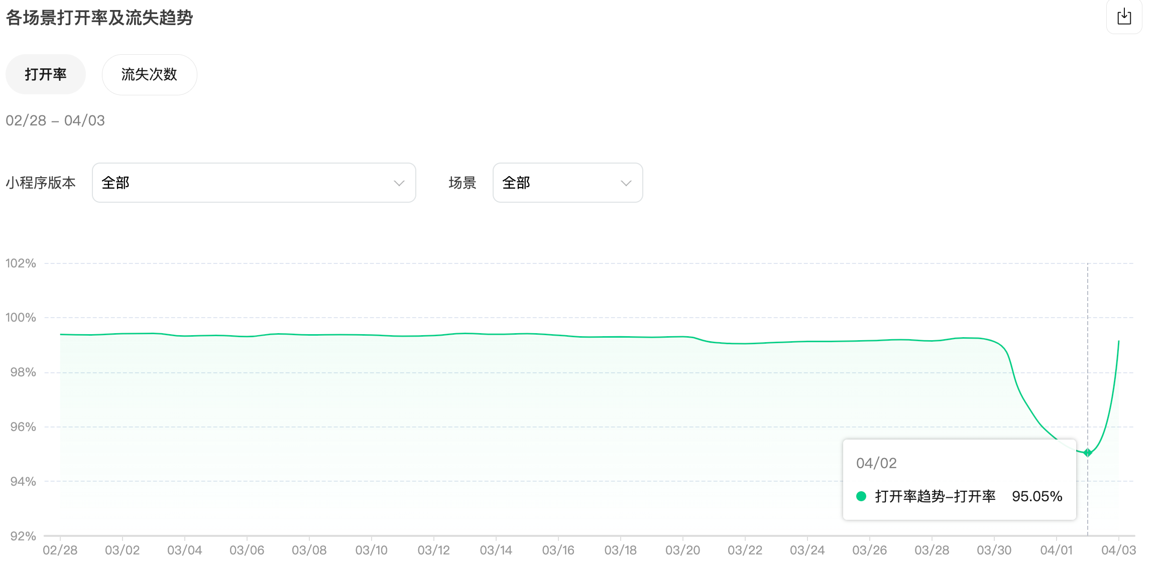 最近有用户反馈小程序打开很慢,一直处于下载状态(图1),我查看了后台性能分析数据看到3.31号-4.2号小程序打开率显著下降(图2),4.3号数据回归正常,是什么原因导致的呢?这几天微信网络异常?同时微信广告加载耗时也明显上升了(图3)。