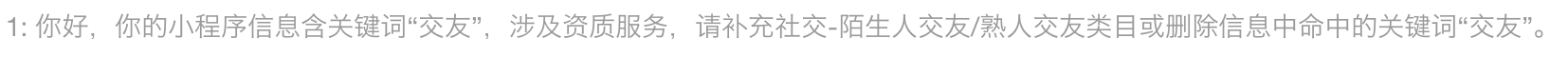 2.小程序提供交友功能,需添加“社交-陌生人/熟人交友”类目,该类目与(社交-社区/论坛、社交-笔记)无包含关系,若暂无法补充该类目,或建议自查代码整体移除交友相关服务,包括但不限于小程序基本信息含“交友”关键词、前端展示、代码包、内容标签等。