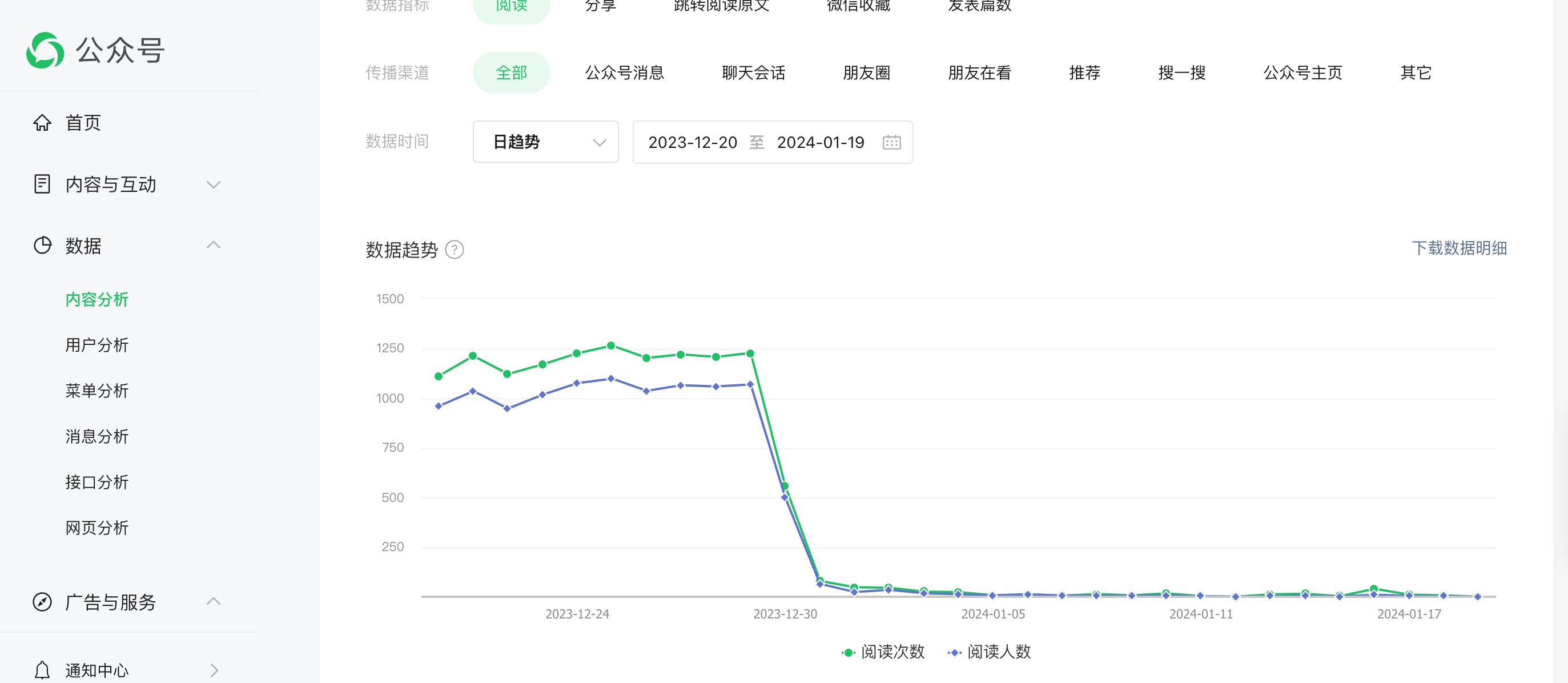 从2023年12月29日开始微信公众号流量断崖式下跌,且无法恢复,疑似被限流导致。但并未收到任何官方通知有违规行为。请官方帮忙查看。
