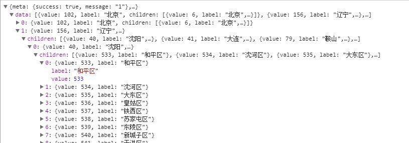 cityChange(e) {let val = e.detail.valuevart =this.cityValue// 城市数据坐标 0 0 0const allCity =this.allCityif(val[0] !== t[0]) {let urban = []// 市处理val[val[0], 0, 0]allCity[val[0]].children.forEach((val, index) => {urban.push({'value': val.value,'label': val.label})})const addAll = [{value:'',label:'全部'}]this.urban = [...addAll, ...urban]this.cityValue = [e.detail.value[0], 0, 0]// 区处理let area = []const allArea = [{value:'',label:'全部'}]this.area = [...allArea, ...area]this.cityValue = [e.detail.value[0], 0, 0]this.$apply()}if(val[1] !== t[1]) {let area = []const addAll = [{value:'',label:'全部'}]val[val[0], val[1], 0]allCity[val[0]].children[val[1] - 1].children.forEach((val, index) => {area.push({'value': val.value,'label': val.label})})this.area = [...addAll, ...area]this.cityValue = [e.detail.value[0], e.detail.value[1], 0]this.$apply()}if(val[2] !== t[2]) {this.cityValue = e.detail.value}},数据