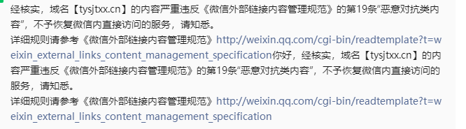 你好,经核实,域名【tysjtxx.cn】下的违规内容已经修改,现已恢复微信内直接访问的服务,请知悉。