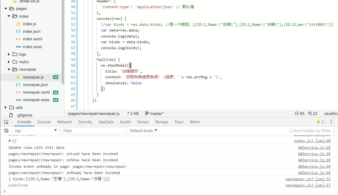 //var kinds = res.data.kinds; //是一个数组,[{ID:1,Name:\"空调\"},{ID:2,Name:\"冰箱\"},{ID:12,me:\"tttt001\"}]