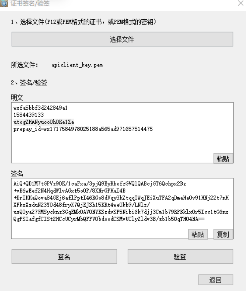 情况二:如果不能确定统一下单和调起支付参数是否有问题,可以通过商户的私钥生成签名,然后再利用生成的签名发起请求看看,能不能成功: