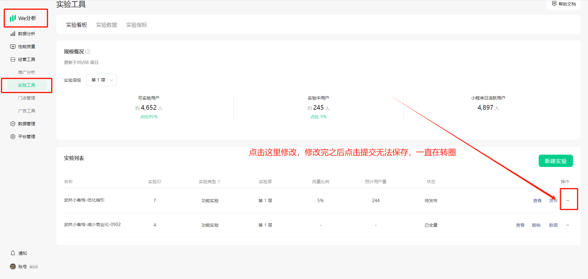 这边公众号平台WE分析-实验工具这边修改还没发布的实验无法保存,之前是可以保存的,昨天早上开始到现在都无法保存,辛苦帮忙看看是什么原因