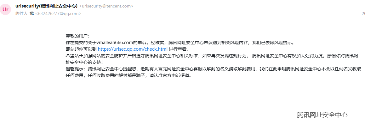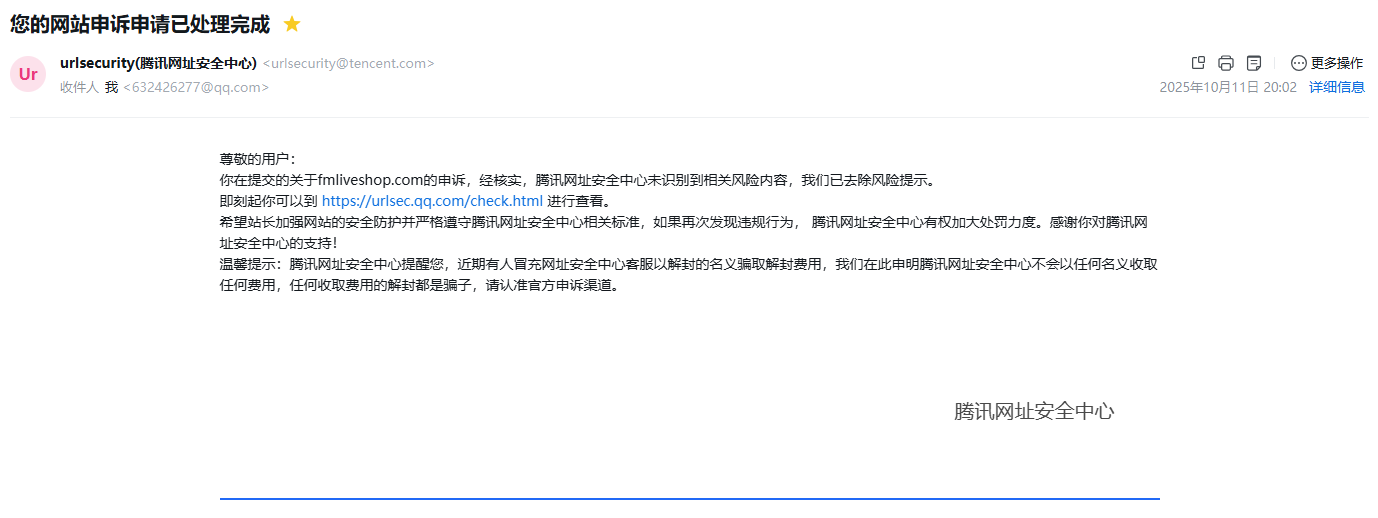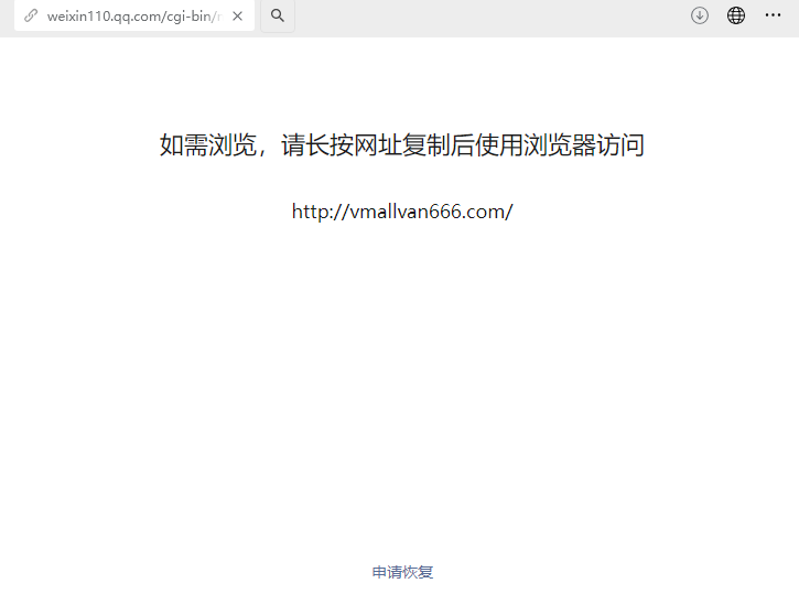 尊敬的腾讯安全团队您好! 在微信内访问我们公司官网域名 vmallvan666.com 和 fmliveshop.com 还有 zmxhshop.cn 时,被提示“如需浏览,请长按网址复制后使用浏览器访问”,疑似被安全机制误拦截。已经申诉成功 还是无法正常访问,如果有问题我司将积极配合整改
