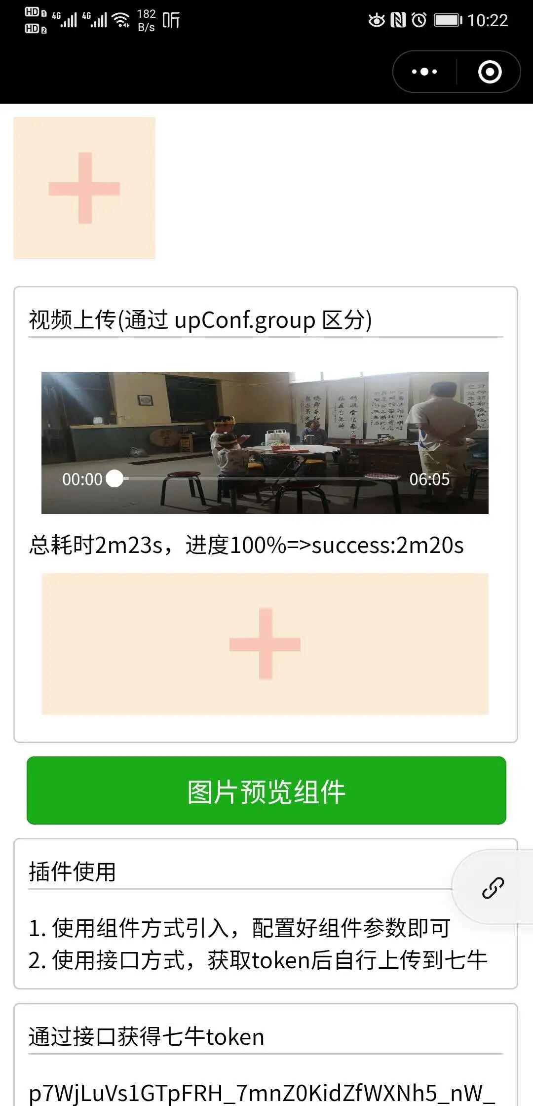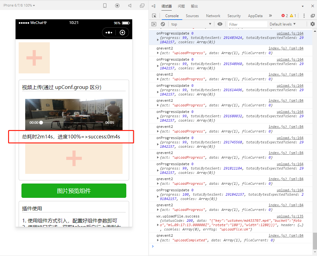 安卓手机(华为p20 pro)非常大的差异 ,总耗时2分23秒,从进度100% 到接口返回 success 用时 2分20秒
