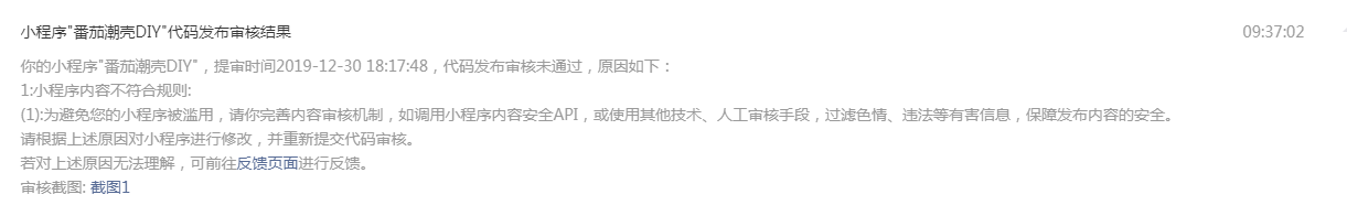小程序提交审核时未通过,提示需要接入内容安全API接口,接入后依然提示审核失败。审核截图如下,是调用API后依然成功上传了违规图片的意思吗?