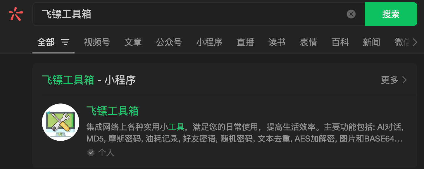 搜索的时候不管是输入 飞镖 还是 工具箱 , 都翻完了也没有我的小程序这个是为什么?不能搜索吗???