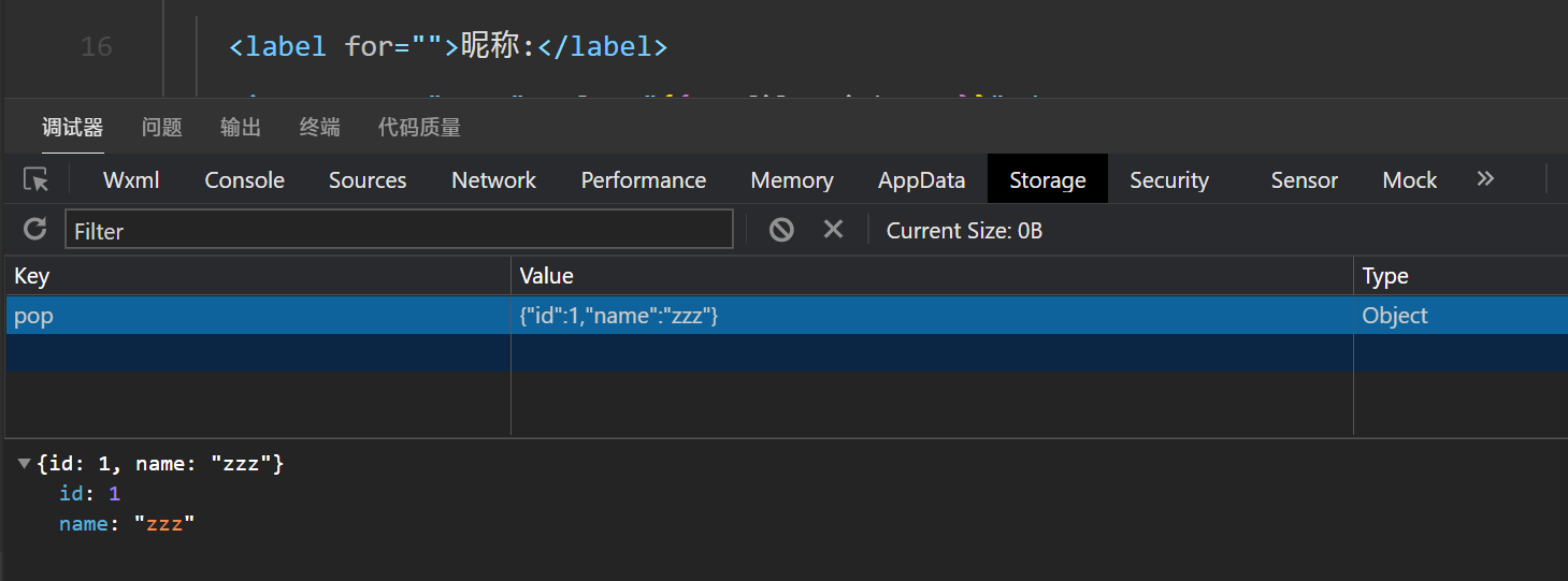 // wx.setStorageSync('pop', {id:1,name:'zzz'})