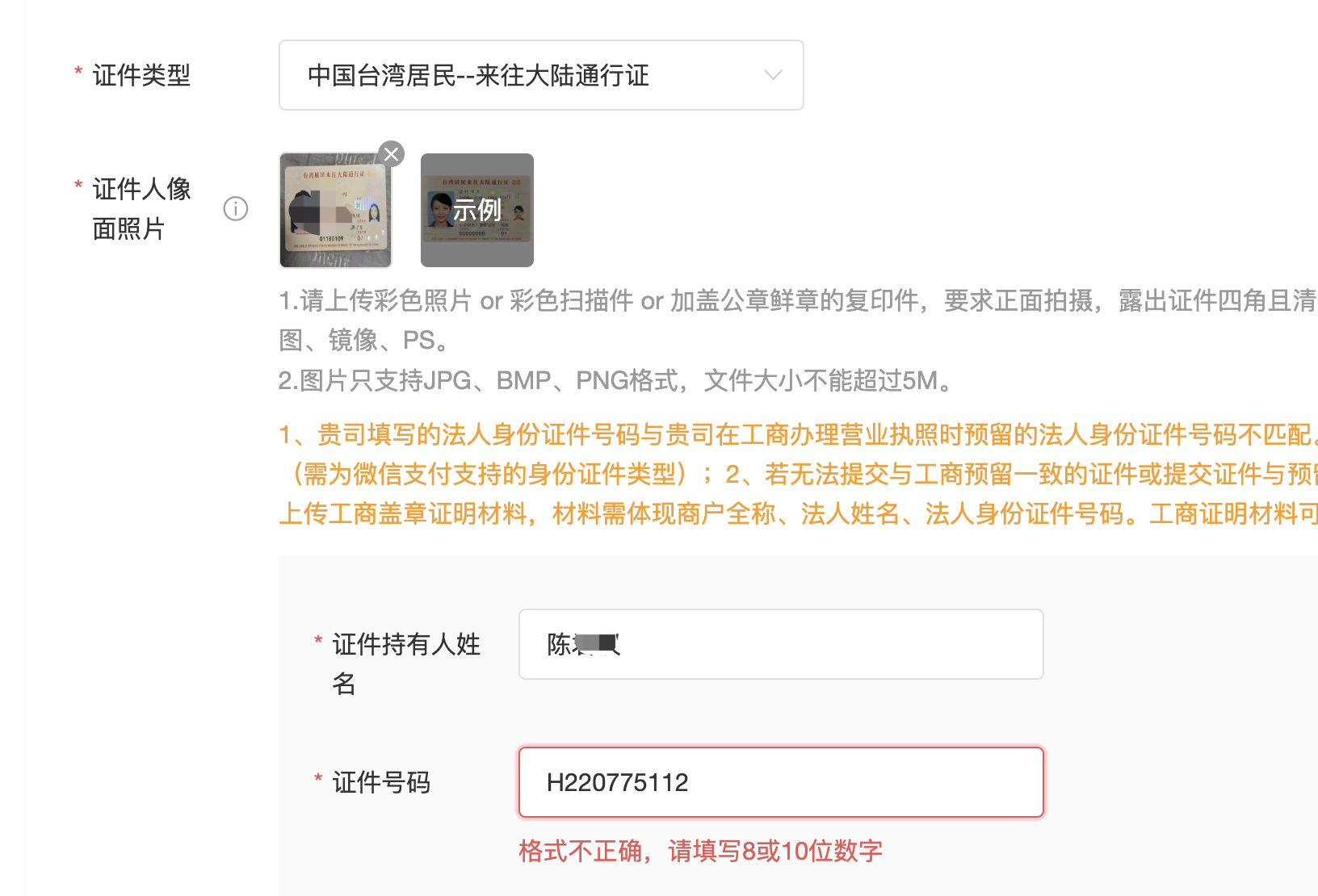 刚刚注册认证的小程序(大陆主体/法人台湾人),开通支付的时候总是身份证不符合?按照示例上传的大陆通和台湾身份证,提示 8/10 位数字证件号码。输入 大陆通上的8 位号码不对,输入台湾身份证上的 10 位号码但是第一位是字母-报错。很奇怪就是同样的身份信息注册小程序的时候可以通过,但是开通支付无法通过。也没有路径申诉。请问怎么解决呢?