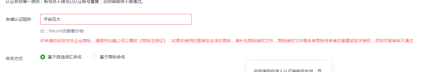 你好,贵方可以先选择基于商标的命名方式先提交认证,商标相关字段用其他证件(营业执照等)代替提交,审核人员后续核实后会更改为基于自选的命名方式认证,请了解