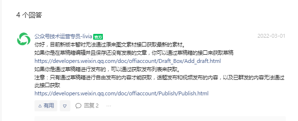 问下微信公众号 支不支持调用获取“已群发”的文章数据接口?官方文档只介绍了调用和“已发布“和草稿箱的文章,,,获取素材列表的接口又不是最新的文章数据,,,所以有获取“已群发”的文章数据接口吗?有的话告知下是在文档哪?没有的话能方便告知下没有吗?