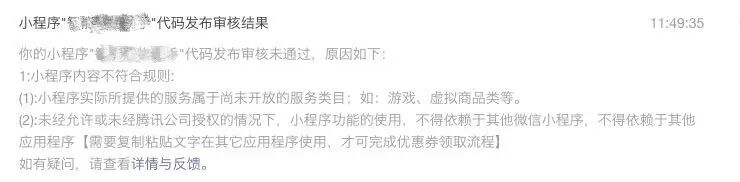 疑问2:审核给出的原因是需要复制文字到其他应用领券,此处依赖其他应用程序,但这个点在第二次提交时就已经去掉了。